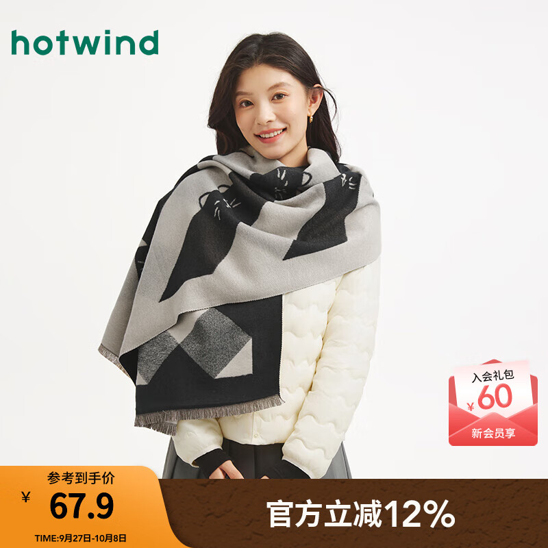 热风(Hotwind)【商场同款】女士围巾2025年冬季新款格纹小猫梭织气质保暖披肩 88米黑 67*180cm