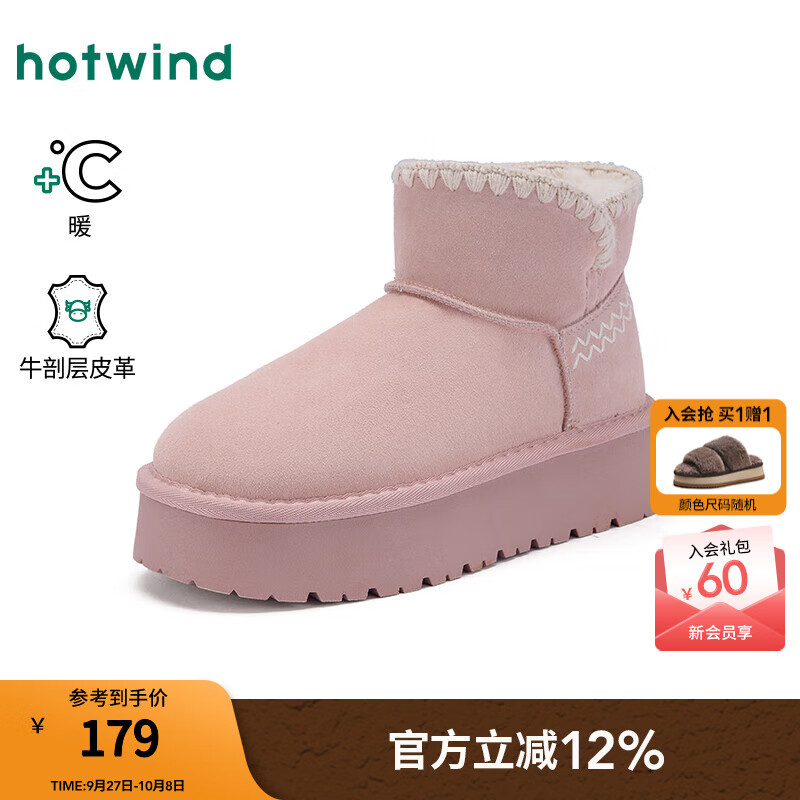 热风(Hotwind)厚底雪地靴女鞋2025年冬季新款增高加绒加厚短靴百搭棉鞋靴子 14粉红 40
