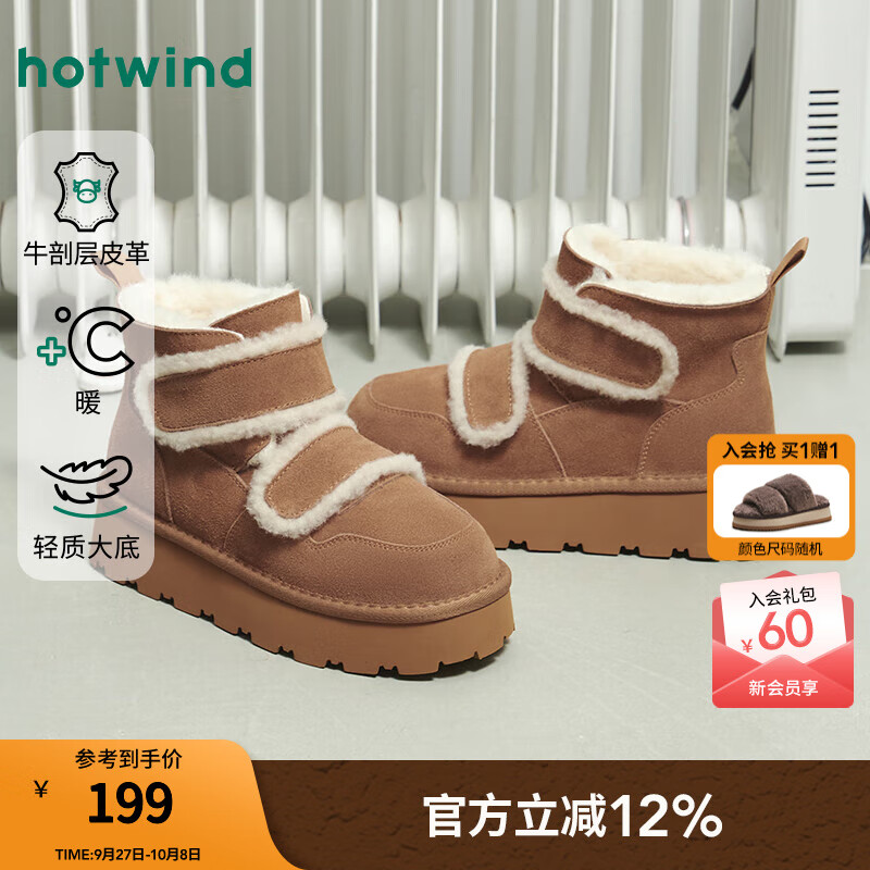 热风(Hotwind)厚底雪地靴女鞋2025年冬季新款增高加绒加厚短靴百搭棉鞋靴子 02棕色 37