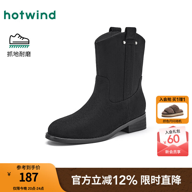 热风西部牛仔靴女2025年冬季新款百搭中筒时装靴棕色美拉德靴子女 01黑色 36