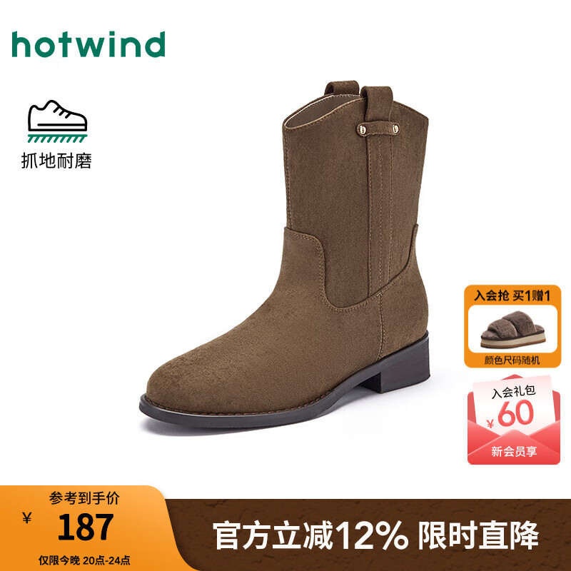 热风西部牛仔靴女2025年冬季新款百搭中筒时装靴棕色美拉德靴子女 08杏色 36