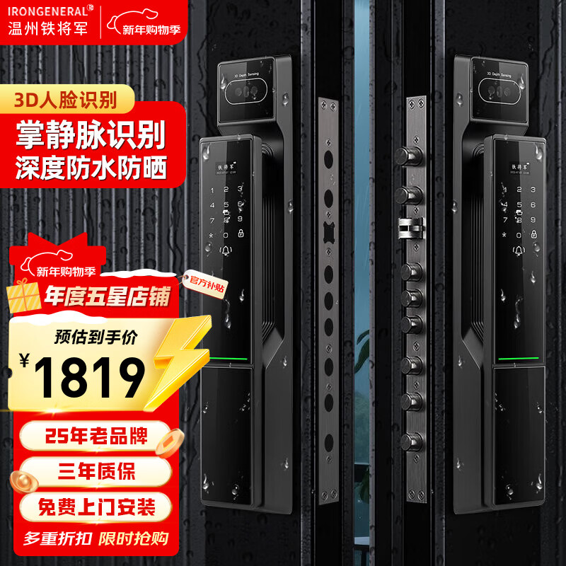 IRONGENERAL铁将军双开门深度防水防水晒智能锁3D人脸识别指纹锁大门电子锁 曜石黑-双开
