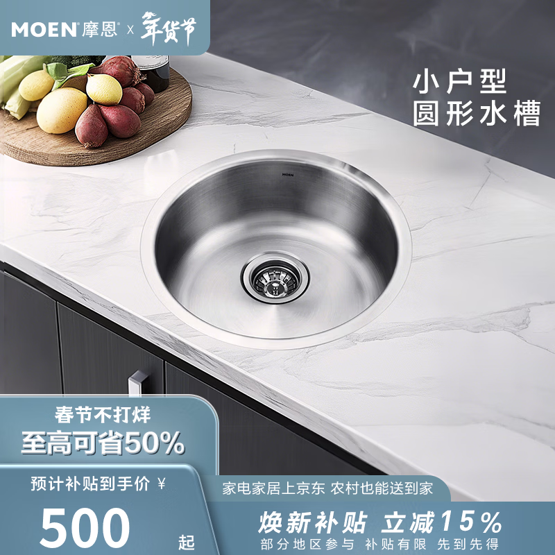 摩恩(MOEN)304不锈钢圆形水槽单槽套餐小户型阳台台下23607 435*165 不锈钢单圆槽(不含龙头)