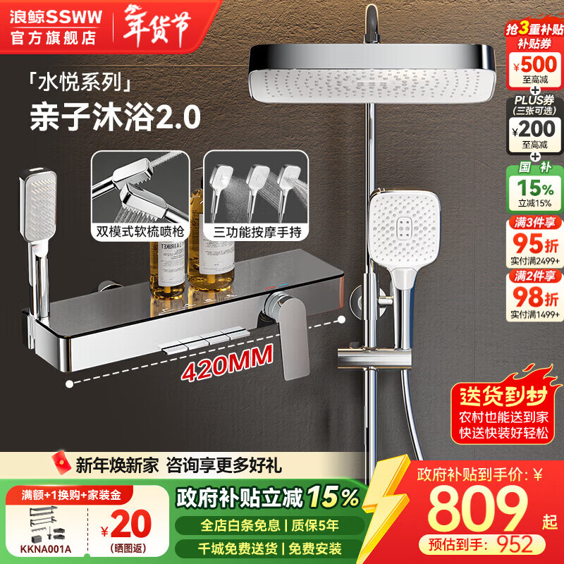 浪鲸(SSWW)卫浴淋浴花洒套装一体精铜钢琴键家用增压卫生间沐浴器2026新款 铬色【冷热四功能】水悦系列062A