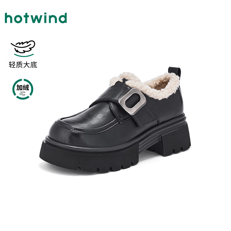 热风(Hotwind)厚底乐福鞋女2025年冬季新款英伦风加绒小皮鞋小个子百搭女鞋 01黑色 39