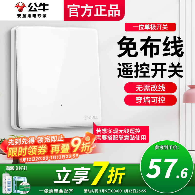 公牛(BULL)无线开关面板免布线 智能无线子母开关 家用远程遥控开关控制器 一位单极开关【建议搭配随意贴】