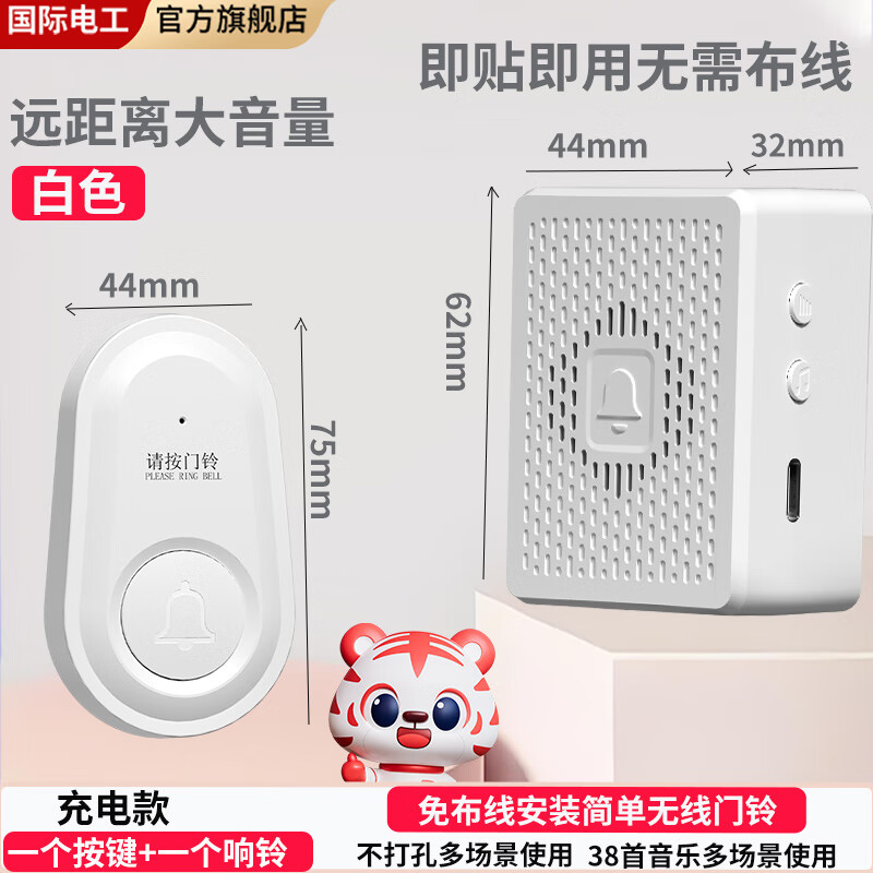 FDD国际电工无线门铃家用距离远声音大黏贴即用免插电穿透力强老人紧急呼叫器 充电款白色【一个按键+一个响铃】