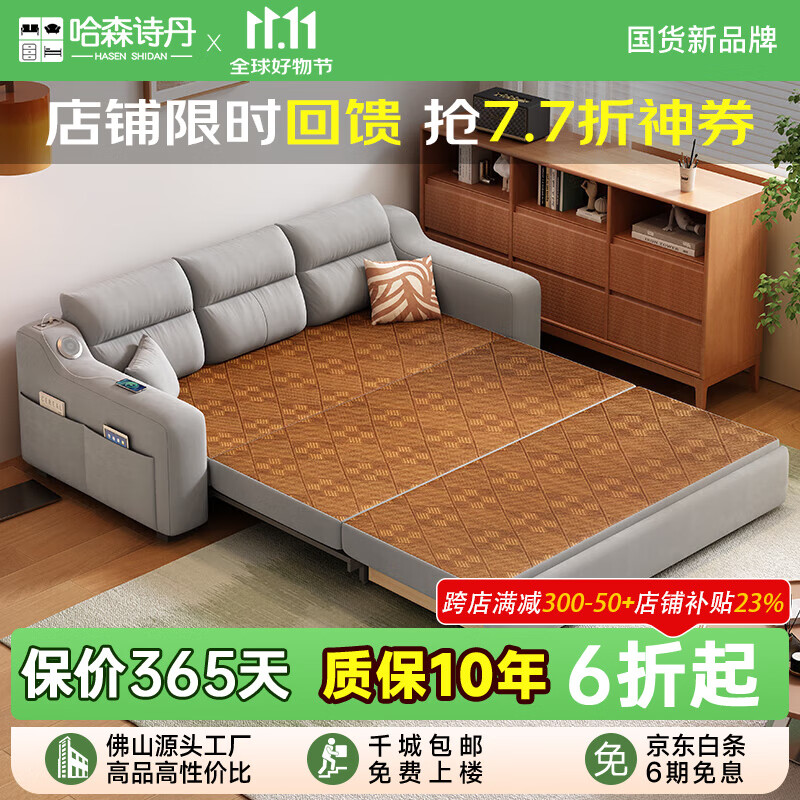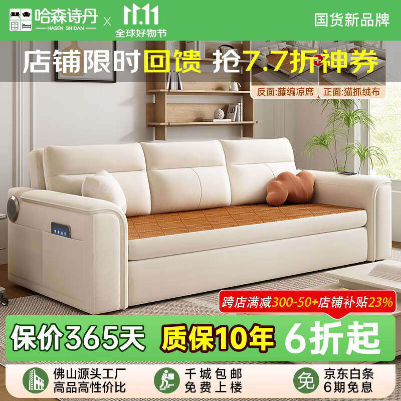 哈森诗丹可折叠带凉席两面用沙发床坐卧一体小户型客厅高端多功能布艺沙发 外径:1.4m(无储物)S+级猫抓绒 高弹海绵款(软硬适中)
