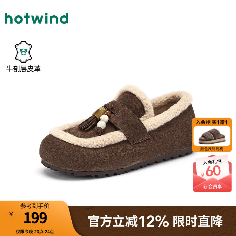 热风(Hotwind)女鞋加绒乐福鞋2025年冬季新款休闲毛毛鞋勃肯风保暖棉鞋女豆豆鞋 02棕色 34