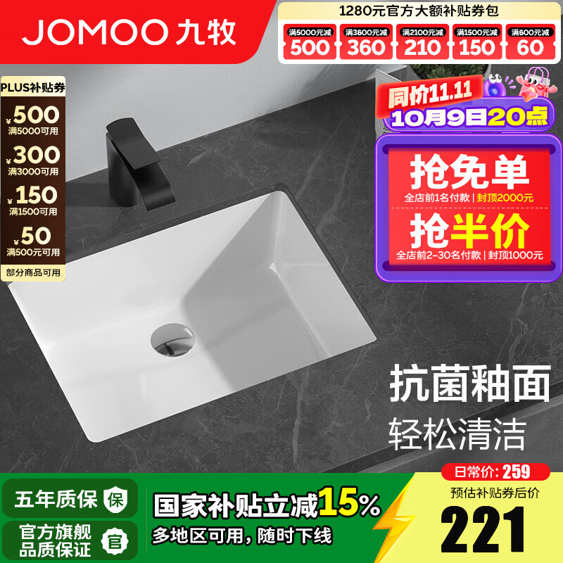 九牧(JOMOO)方形陶瓷台下盆卫生间防溅抗菌易洁釉面洗手池台盆一体(不含下水) 12756【小方形台下盆】 均码