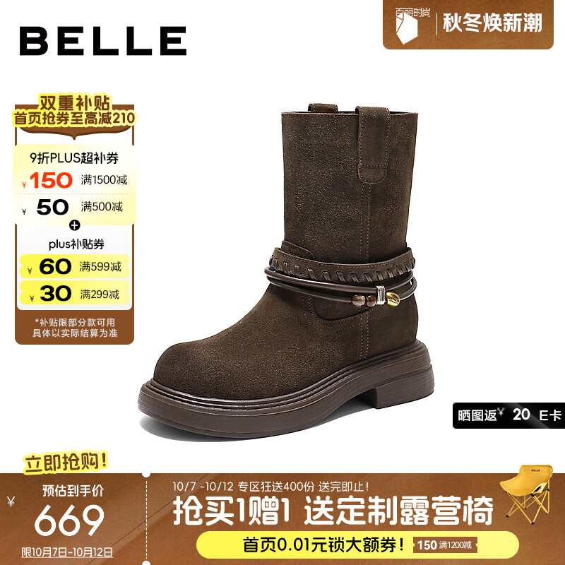 百丽(Belle)厚底增高休闲靴女2025冬新商场同款复古绒面西部靴E8J1DDZ5预售 咖色-绒里 37