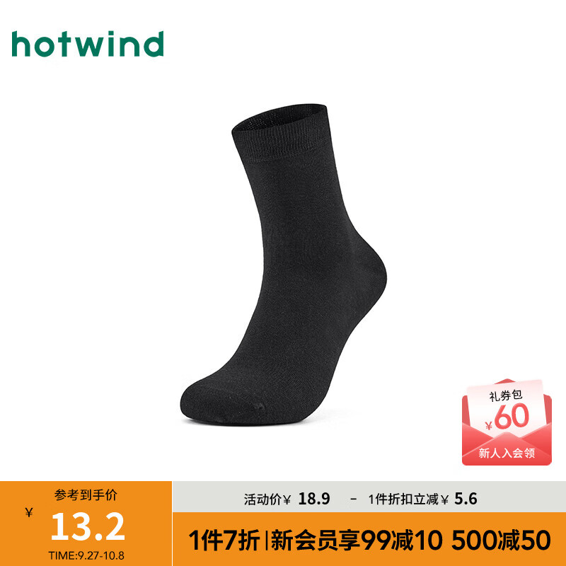 热风【商场同款】男士袜子中帮袜25年秋新款素色橡筋中帮袜透气棉袜子 01黑色 1双 均码
