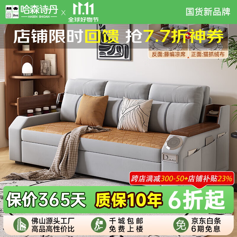 哈森诗丹多功能沙发床一体两用小户型家用客厅原创带凉席两面用可折叠沙发 外径:1.3m(无储物)S+级猫抓绒 高弹海绵款(软硬适中)