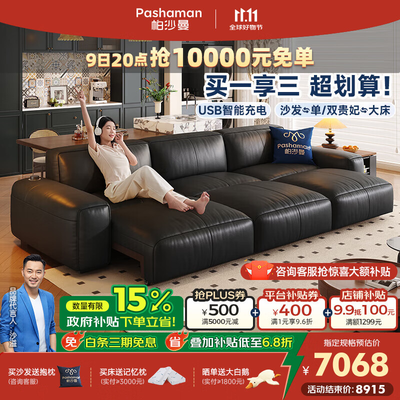 帕沙曼大黑牛真皮电动沙发床2025新款意式复古客厅书房多功能充电7072ZP 【三电动】2.95米多人位(自由充电 无线束缚) 【舒享版 l 新一代抗菌生态牛皮】