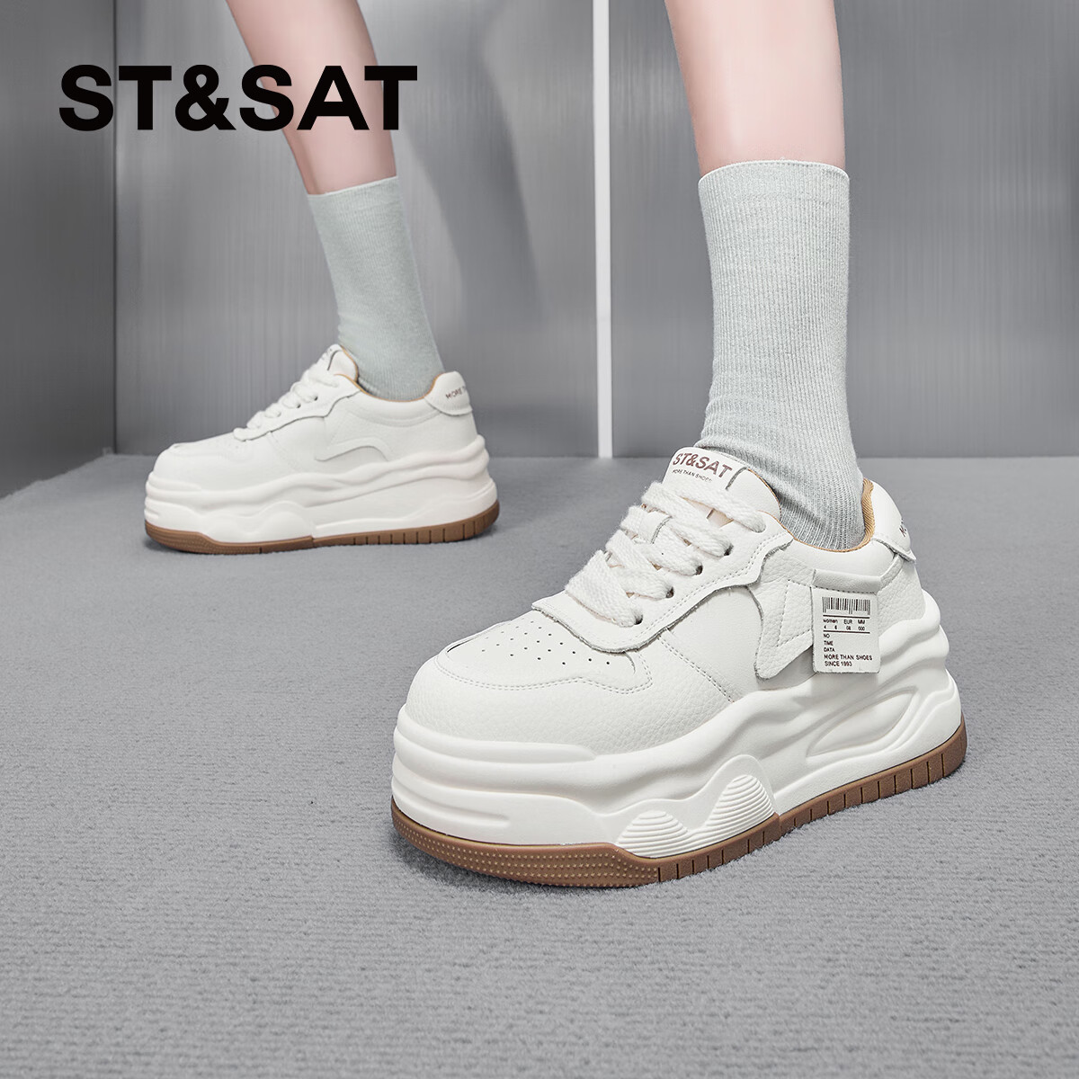 星期六松糕板鞋子女秋冬2025新款厚底增高百搭小白鞋舒适休闲女鞋 米白色【单里】 37