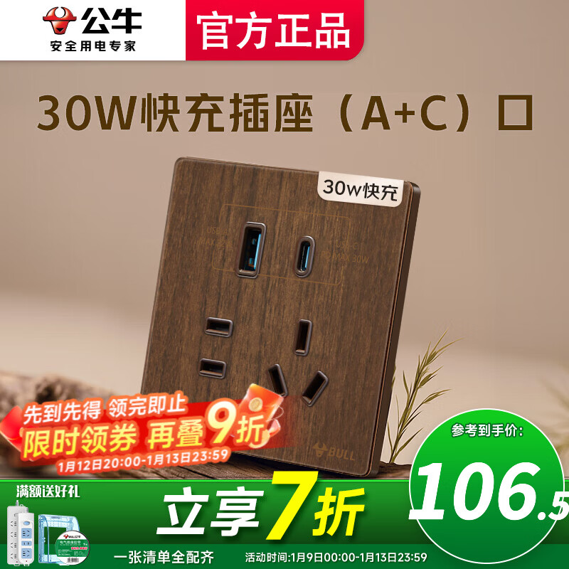 公牛(BULL)开关插座面板快充插座官方超薄拨杆G70胡桃木86型复古开关仿木纹 30W快充插座(A+C)口