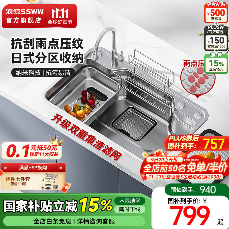 浪鲸(SSWW)厨房拉伸水槽纳米不锈钢台下盆台上洗碗池洗菜盆家用大单槽 C2-78*48配三功能抽拉龙头