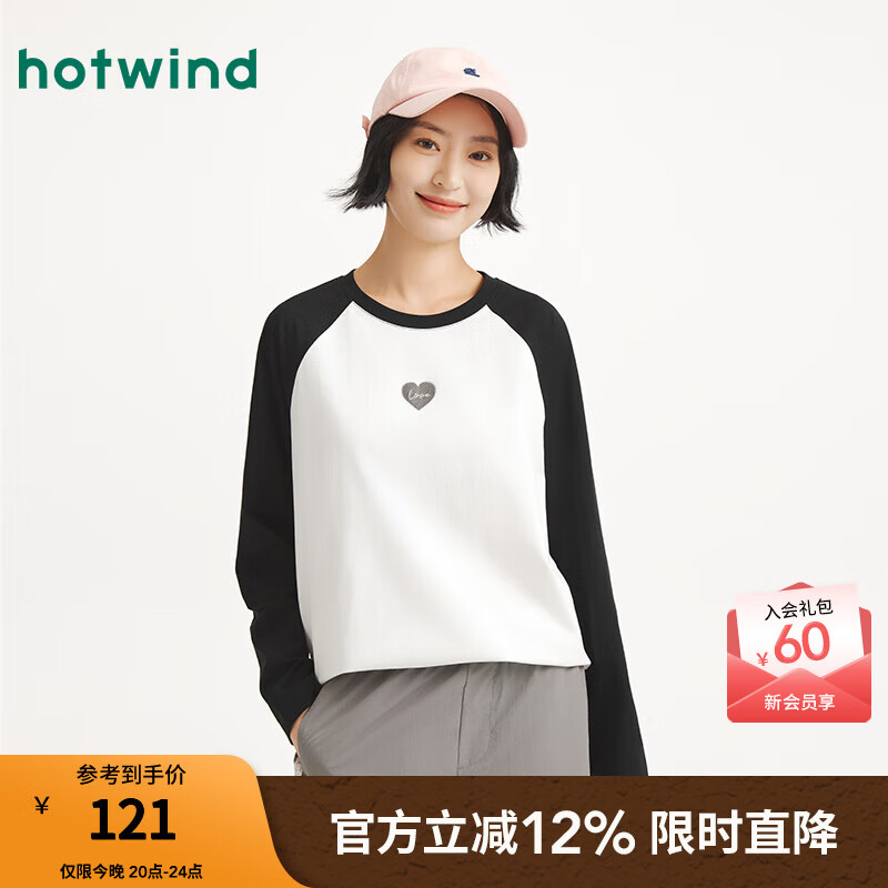 热风【商场同款】女士长袖T恤上衣2025年秋新款撞色插肩袖元气内搭t恤 19黑白 L