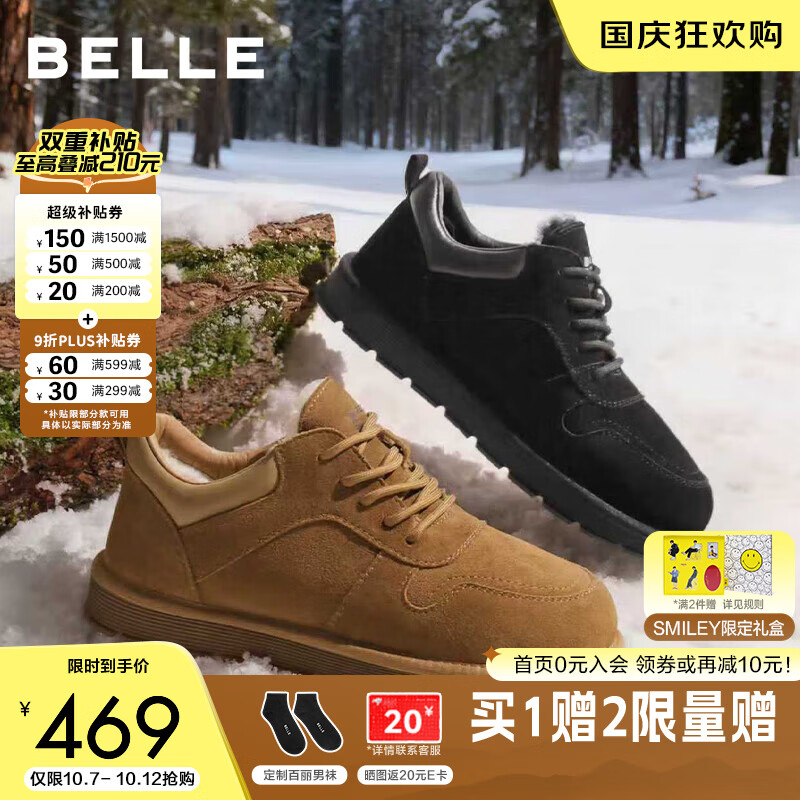 百丽户外低帮雪地鞋男2025新款冬季厚实保暖鞋毛毛鞋A2258DM5【预售】 黑色 38