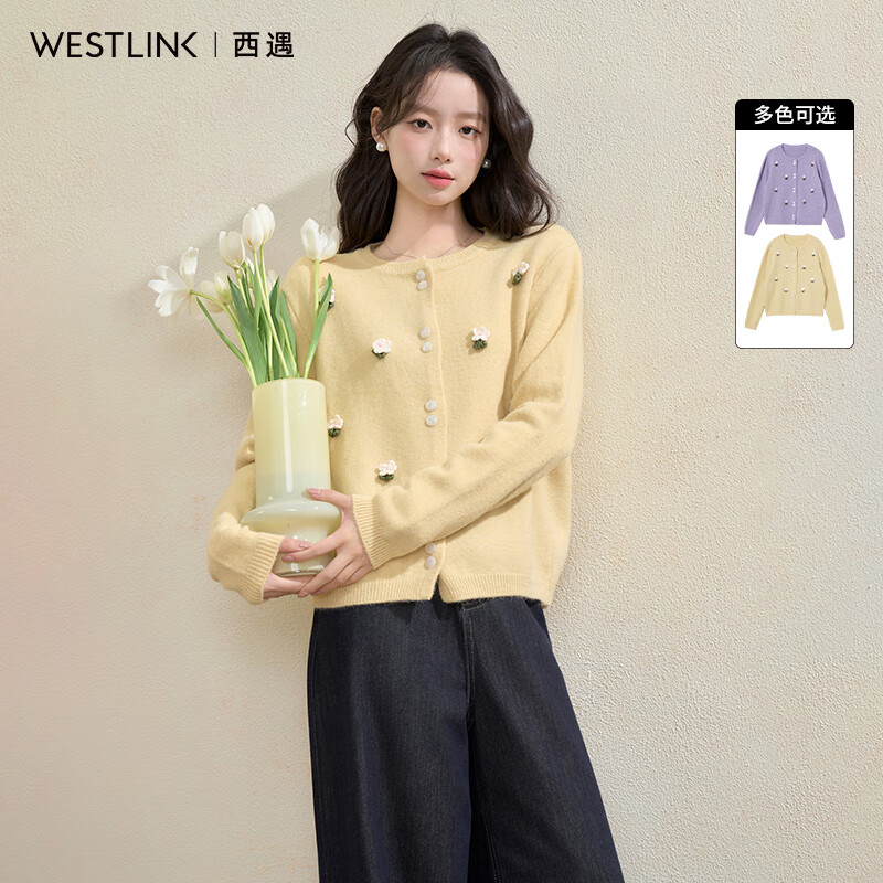 西遇(Westlink)宽松毛衣外套女秋季新款设计感立体花朵圆领针织开衫 黄色 (预售15天) M (160)