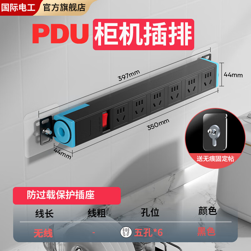 FDD国际电工PDU电竞专用桌面排插隐藏式无痕安装插板防过载家用桌下接线插座 普通单段6位五孔开关双断黑色【无线】