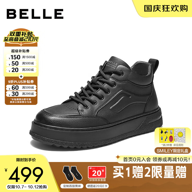 百丽高帮休闲板鞋男25新款冬季厚底增高户外潮搭短靴加绒A2238DD5 黑色-绒里 38