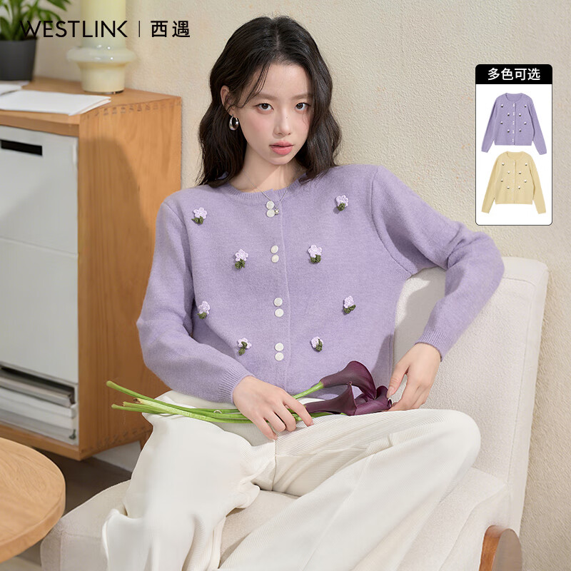 西遇(Westlink)宽松毛衣外套女秋季新款设计感立体花朵圆领针织开衫 紫色 (预售15天) M (160)