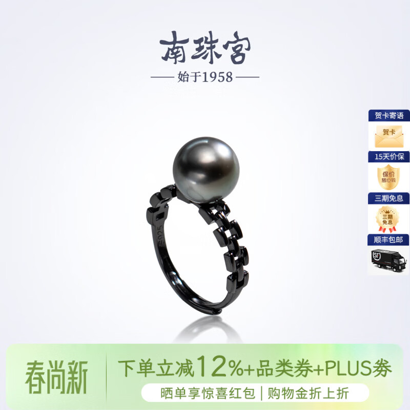 南珠宫炫琮925银大溪地海水珍珠戒指强光圆形高级感情人节礼物 9.0-10.0mm 戒圈13-15号