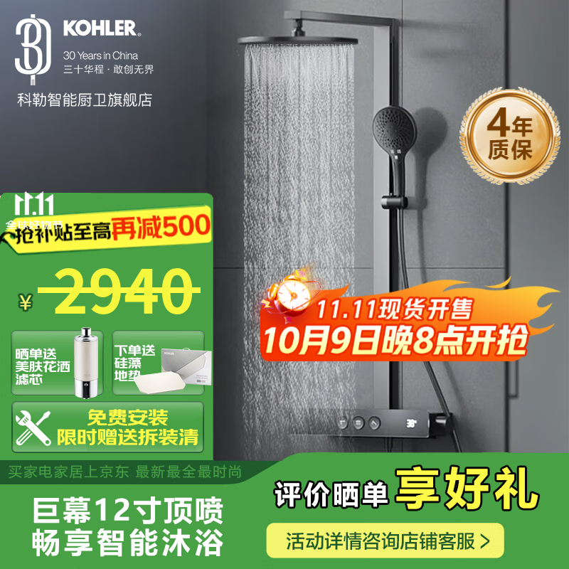 科勒(KOHLER)数显恒温花洒大置物台巨幕顶喷淋浴花洒套装雨神SH10 暮光灰按键控制