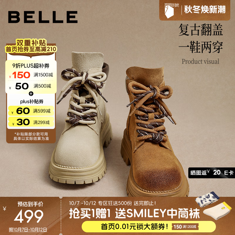 百丽(Belle)复古马丁靴双鞋带大黄靴女25冬新款厚底休闲工装短靴B2745DD5 杏色 36