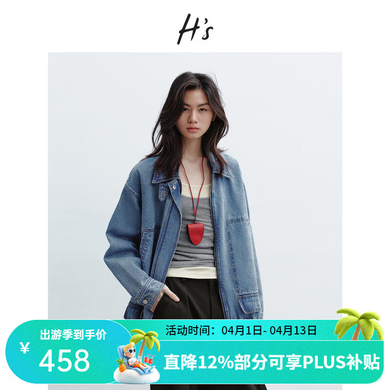 H's纯棉牛仔短外套女26春季新款高级设计宽松廓形双头拉链夹克上衣 牛仔蓝 M