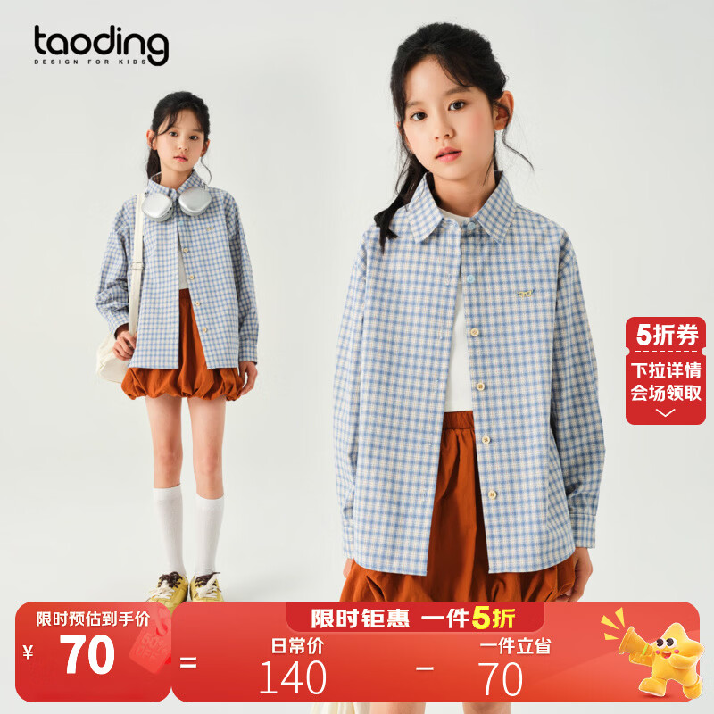 淘町原创女童格子衬衫春季新款大童格纹休闲学院风翻领长袖上衣女 蓝底橘格 170 /L|105-120斤