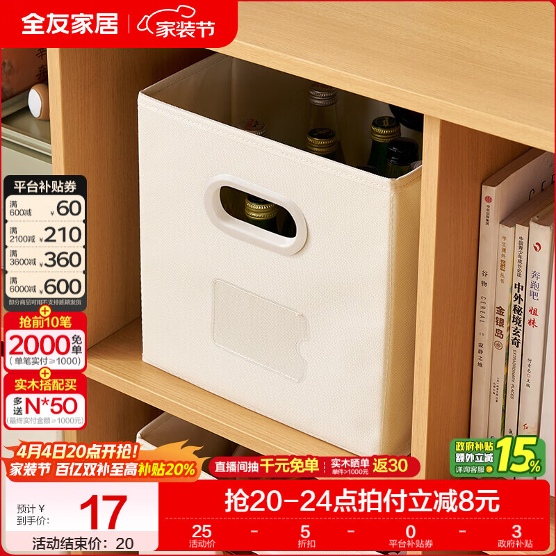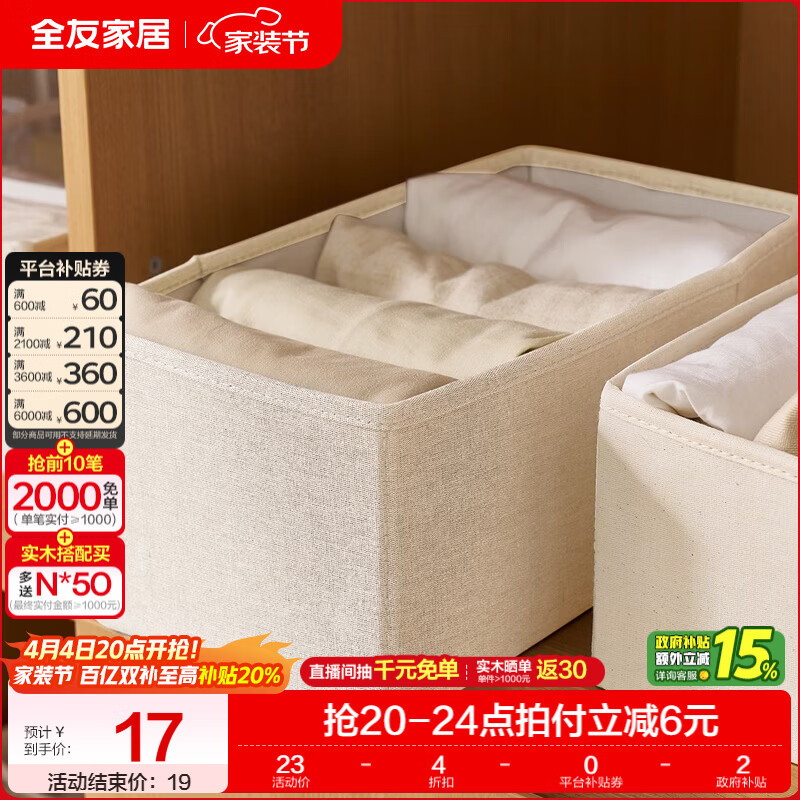 全友家居布艺收纳盒家用抽屉衣柜衣服裤子分隔储物整理盒子防刮耐磨KD 【米白 | 可水洗 | 可折叠】小号收纳箱