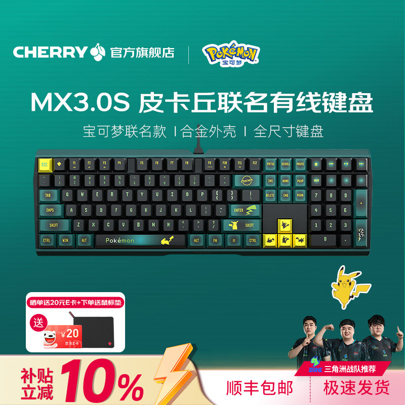 CHERRY樱桃MX3.0S机械键盘 游戏键盘 电竞键盘 有线办公电脑键盘108键 侧刻键帽 合金外壳 适配三角洲 宝可梦皮卡丘联名款-无光-红轴