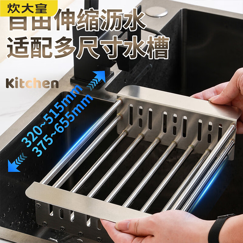 炊大皇水槽沥水架可伸缩置物架不锈钢碗碟碗盘收纳架水池沥碗架洗菜篮 不锈钢-可伸缩沥水篮-小号