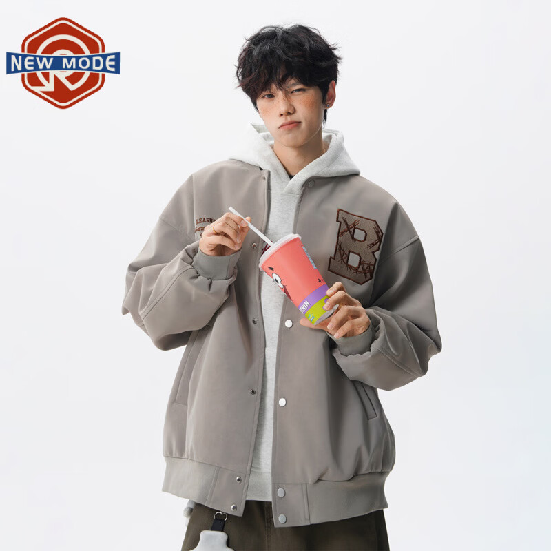 NEW OR MODE美式重磅PU皮棒球服外套男士春季新款潮牌高街宽松青少年情侣夹克 灰色【高品质】 L 【建议110-130斤】