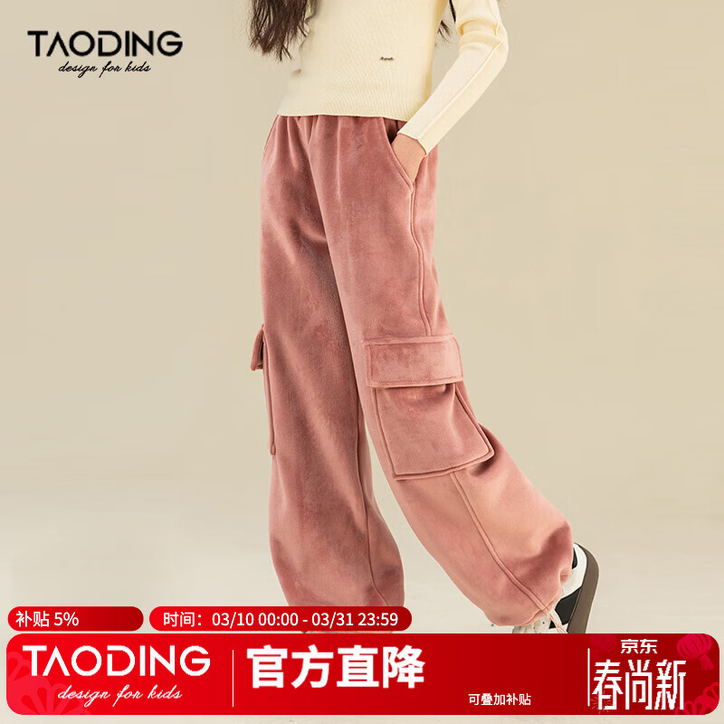 淘町女童裤子加绒秋冬中大童大口袋一体绒粉色宽松女宝工装裤 灰粉色 160