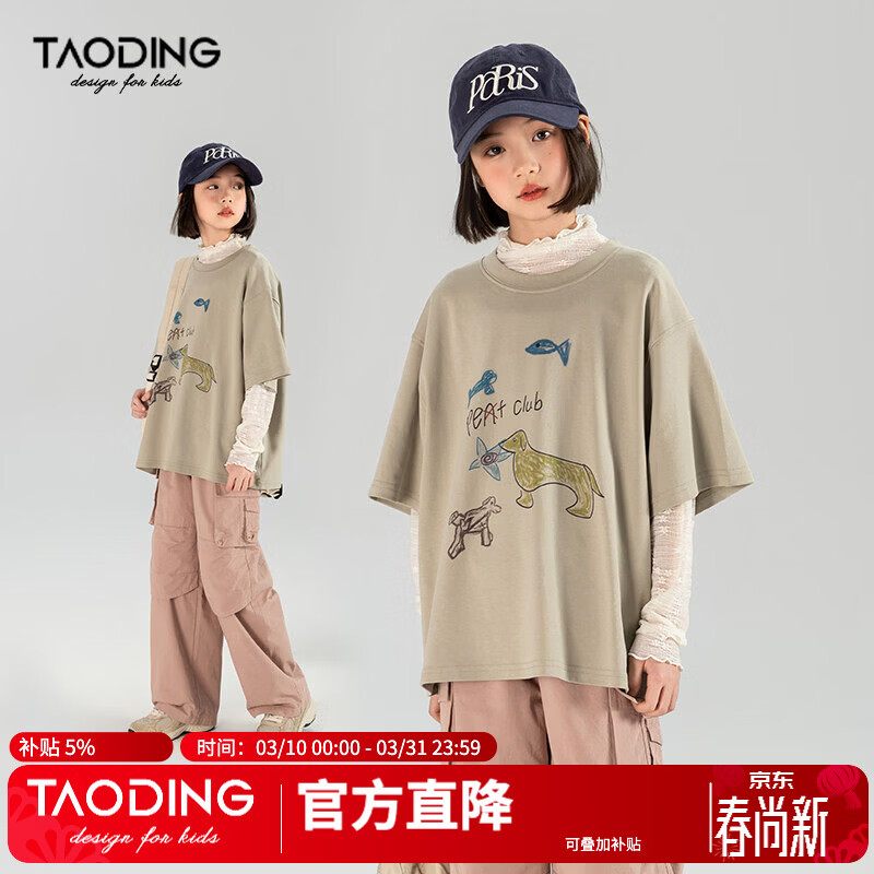 淘町女童短袖T恤春夏新款中大童美式宽松复古T百搭卡通涂鸦上衣潮 灰色 110