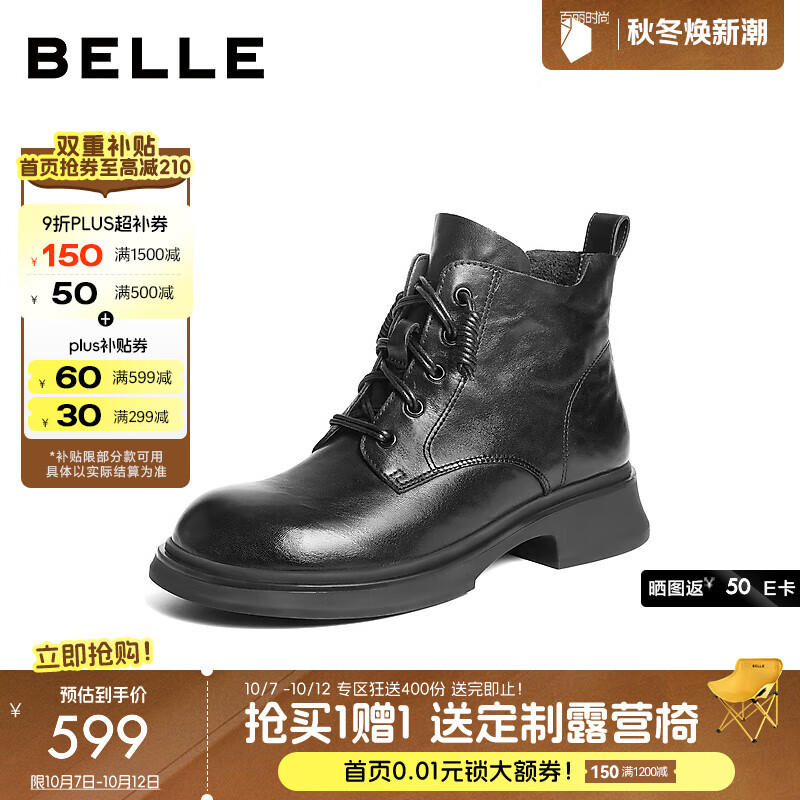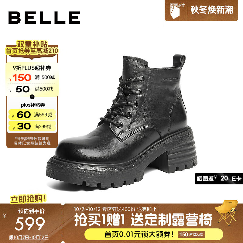百丽(Belle)复古牛皮擦色马丁靴女2025冬新商场同款厚底休闲短靴B2942DD5预售 黑色 34