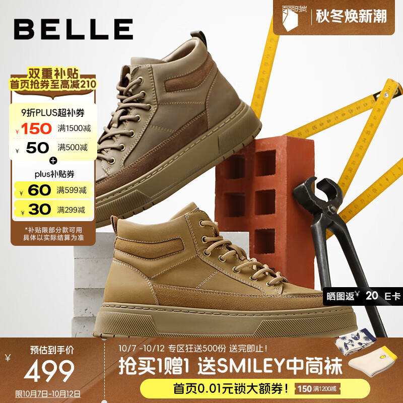 百丽(Belle)复古高帮工装板鞋男2025冬季新款厚底休闲马丁靴加绒A2168DD5 卡其色-单里 39 (245mm)