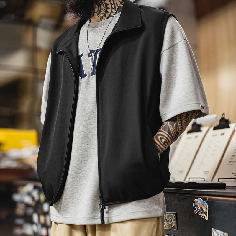 马登工装轻机能户外马甲男开衫立领运动坎肩背心外穿宽松单马夹夏秋 黑色 【双头拉链/夏季男薄款】 L (175)