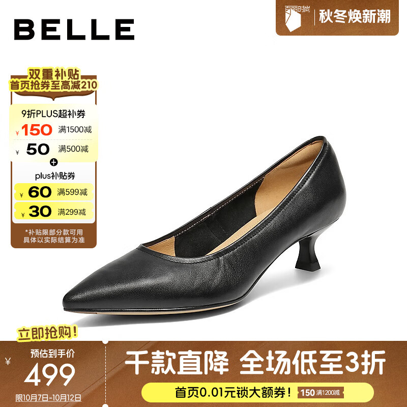 百丽(Belle)羊皮简约优雅单鞋女2025秋新商场同款细跟通勤单鞋BFH01CQ5 黑色 40