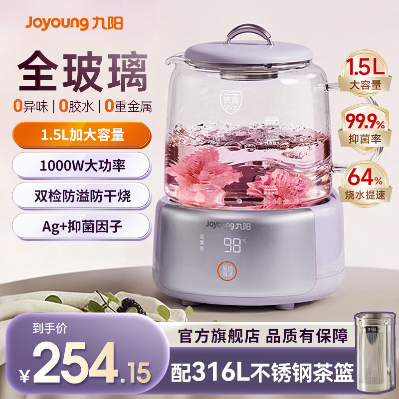九阳全玻璃养生壶1.5L大容量 0胶水恒温壶保温壶炖煮壶一体 烧水壶电热水壶家用多功能煮茶壶WY106 72H长效保温 1.5L 【配316L茶蓝】