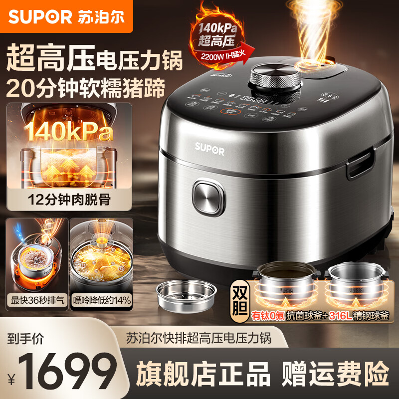 苏泊尔(SUPOR)超高压140kPa鲜呼吸IH电压力锅5L快排有钛0涂层0氟316L钢釜双胆高压锅 0氟球釜双胆 5L