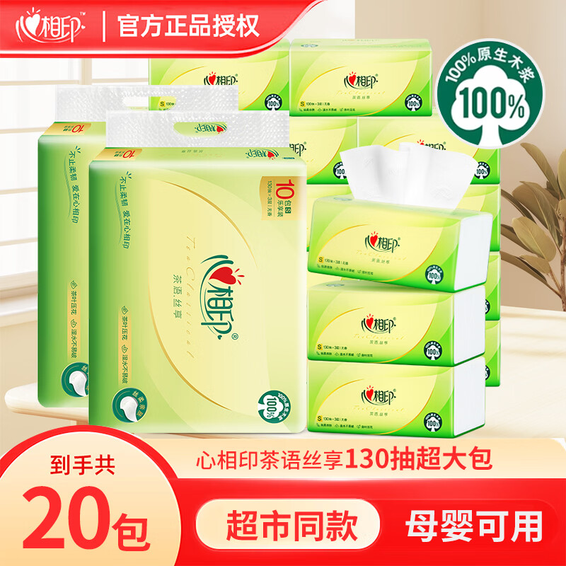 心相印纸巾茶语抽纸家用整箱实惠装餐巾纸130抽20包心心相印纸抽母婴纸 3层 130抽*20包