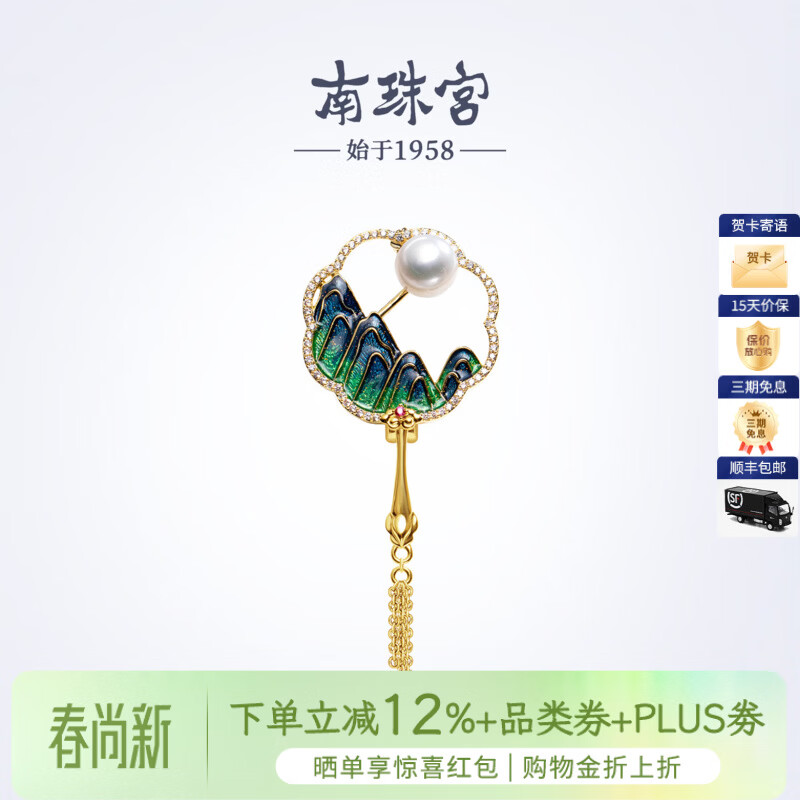 南珠宫山水扇淡水珍珠胸针古风典雅新年礼物送妈妈H115D-J 8.0-9.0mm