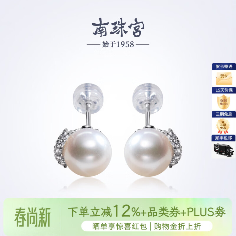 南珠宫睫羽925银淡水珍珠耳环强光圆形白色天然珍珠耳钉生日礼物送老婆 银色款 8.0-9.0mm