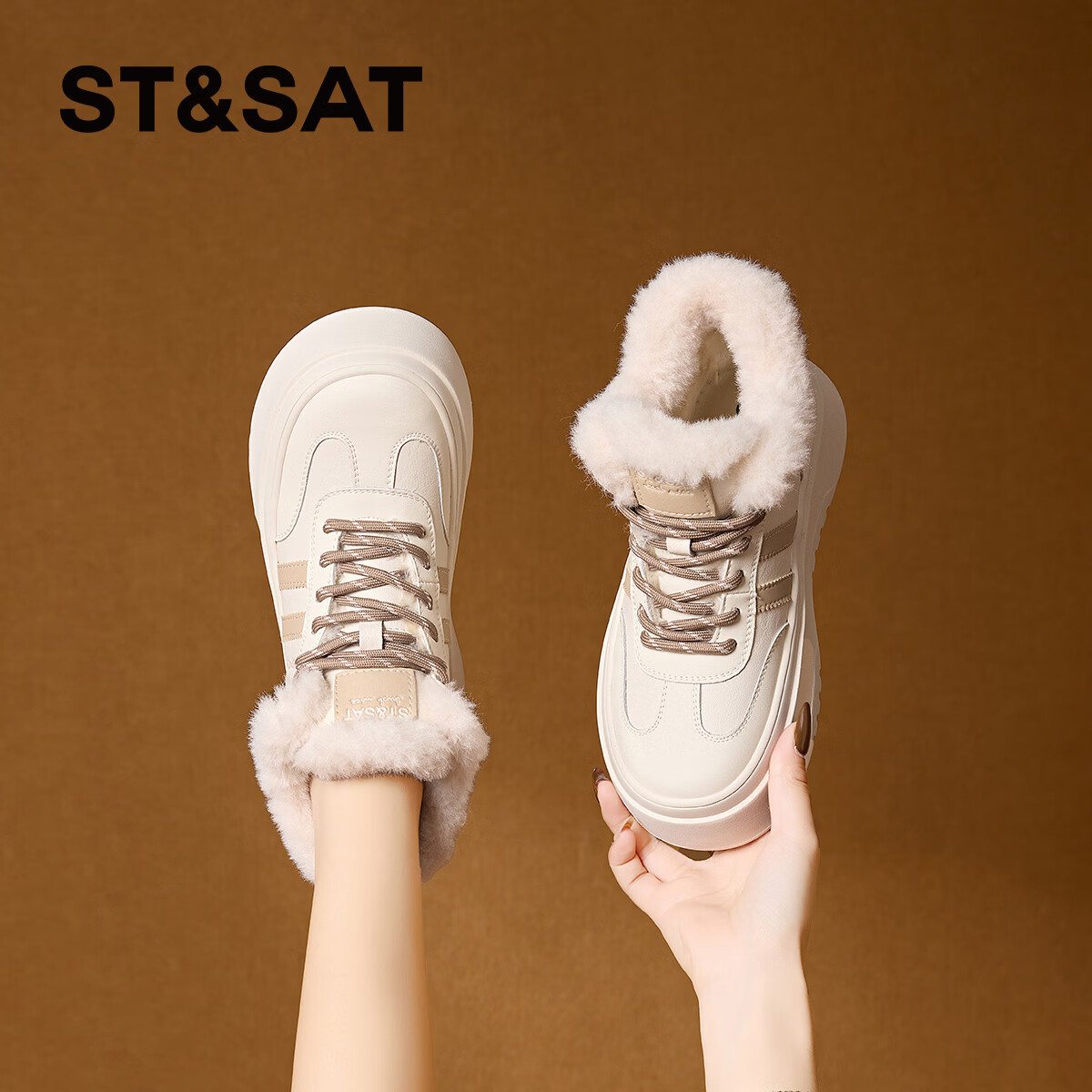 星期六(St&Sat)时尚高帮拼色休闲鞋2025新款气质加绒毛毛德训鞋 杏色 36