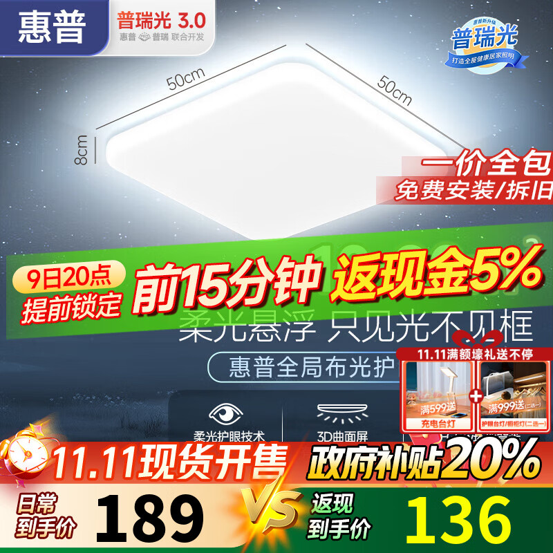 惠普大气吸顶灯现代简约客厅灯家用高亮护眼主灯led中山灯具套餐 60W 20㎡内适用 50cm方形-三色变光