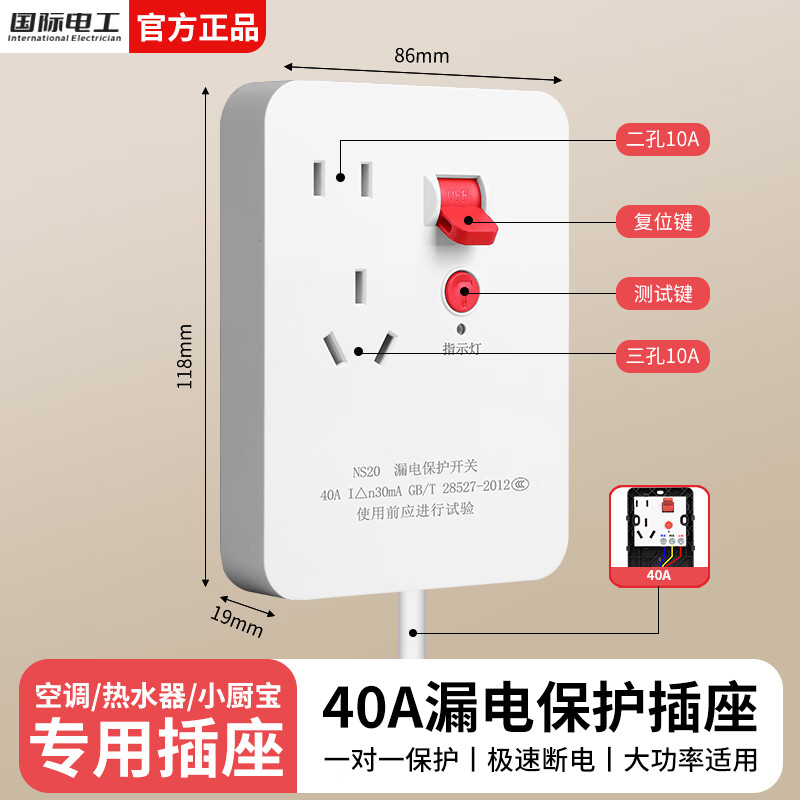 国际电工86型漏电保护器五孔插座40A大功率空调电热水器专用漏保插头开关 白色-五孔漏电保护开关【40A】